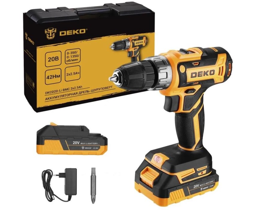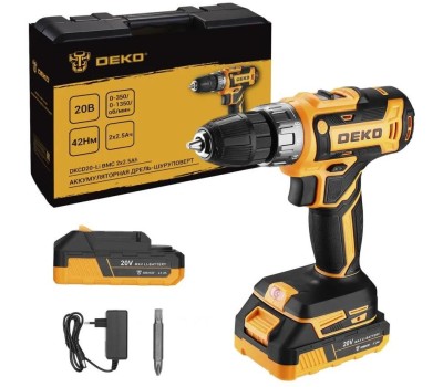 Аккумуляторная дрель-шуруповерт DEKO DKCD20-Li BMC 2x2. 5Ah используется при строительных, слесарно-монтажных работах. Помогает быстро высверливать отверстия нужного диаметра как на деревянной, так и металлической поверхности, быстро вкручивать или извлекать крепеж. Две скорости дают возможность использования высокой или низкой скорости сверления.