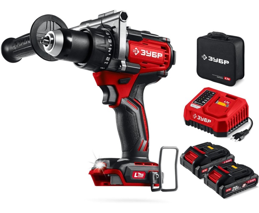 ЗУБР 20 В, 165 Н·м, 2 АКБ LMS (2 А·ч), бесщеточная дрель-шуруповерт, сумка (ДБ-165-22)