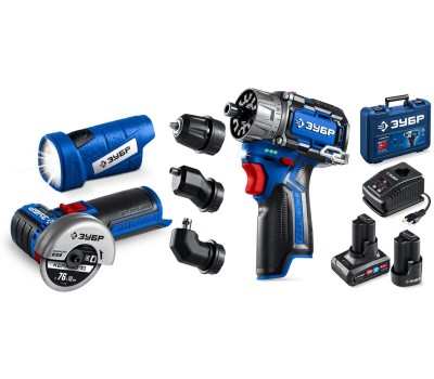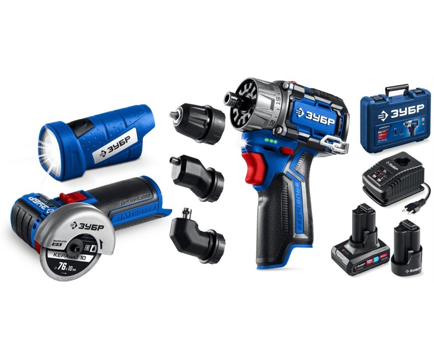 ЗУБР КОМБИ #5 набор: дрель-шуруповерт + мини УШМ + LED фонарь, BRUSHLESS, 12 В, 45 Н·м, 2 АКБ тип Т7 (4 и 2 А·ч), кейс, Профессионал (DB-125-42ABF)