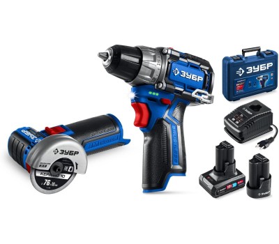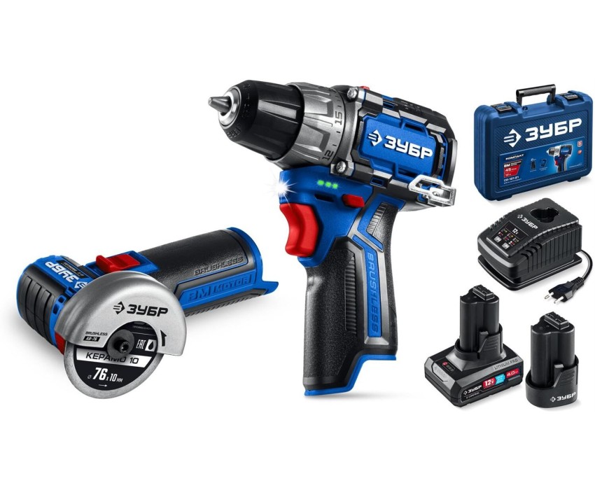 ЗУБР КОМПАКТ #5, набор: дрель-шуруповерт + мини УШМ, BRUSHLESS, 12 В, 45 Н·м, 2 АКБ тип Т7 (4 и 2 А·ч), кейс, Профессионал (DB-121-42AB)