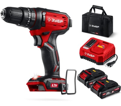 ЗУБР 20 В, 40 Н·м, 2 АКБ LMS (2 А·ч), ударная дрель-шуруповерт, сумка (ДШУ-40-22)