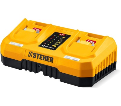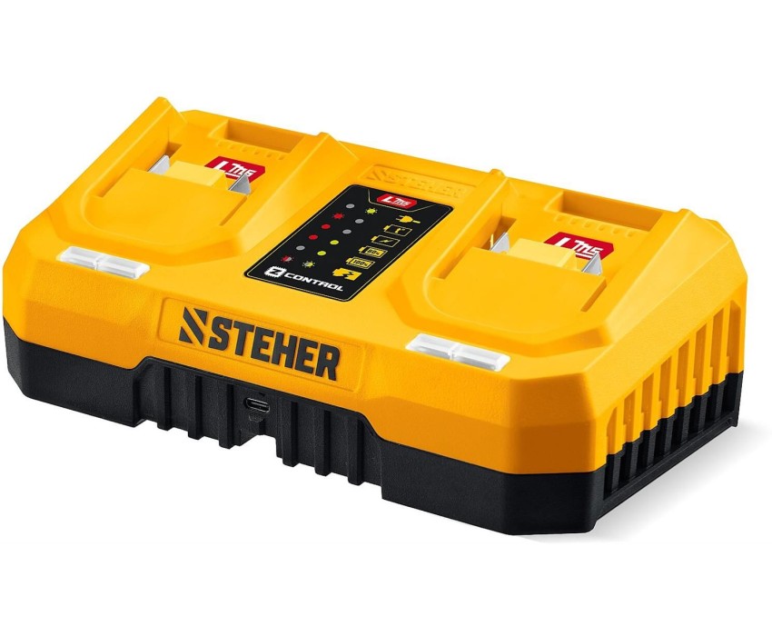 Полностью цифровое интеллектуальное устройство для бережной и максимальной (в отличие от устройств другого типа) зарядки батареи - для полной отдачи Вашего инструмента STEHER Преимущества Зарядное устройство нового поколения с высоким качеством заряда Два порта для одновременной зарядки батарей ускоряет процесс заряда Быстрая зарядка током 3 А на порт позволяет работать практически без перерывов Преимущества интеллектуальной зарядки: - более глубокий заряд позволяет использовать 100% емкости, - высокий КПД, - более щадящая зарядка аккумулятора, - меньше нагрев Управляется электроникой: - диагностика состояния АКБ, - контроль степени заряда и температуры, - автоматическое отключение по окончании зарядки или при неисправности АКБ Защита от повреждений зарядного устройства и аккумулятора: - защита от перепадов напряжения в сети, - защита от перегрева, - защита от короткого замыкания, - защита от переполюсовки контактов Светодиодная индикация процесса зарядки Дополнительный разъём зарядки USB Type-C с поддрежкой быстрой зарядки QC 2.0/3.0/3.0+ и PD 2.0/3.0 Использование Для зарядки батарей аккумуляторного инструмента