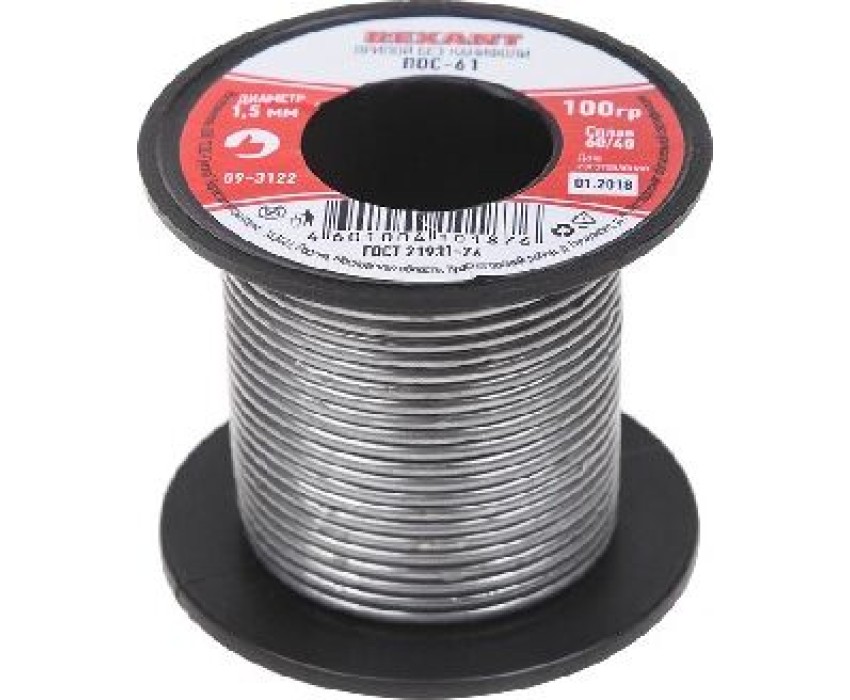 Припой REXANT (09-3122) ПРИПОЙ БЕЗ КАНИФОЛИ ПОС-61 , 100 Г, 1,5 ММ, (ОЛОВО 61%, СВИНЕЦ 39%), КАТУШКА
