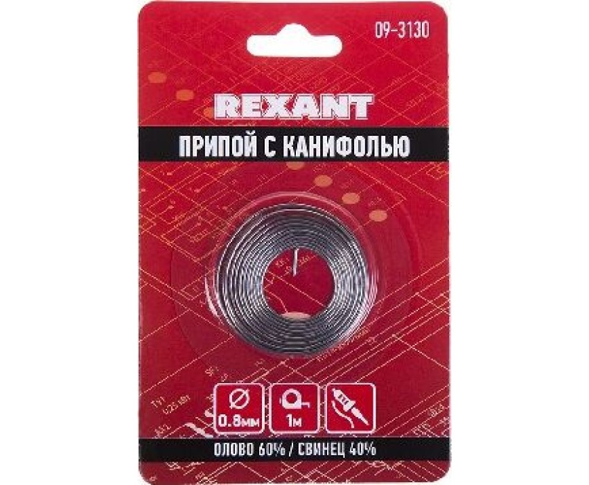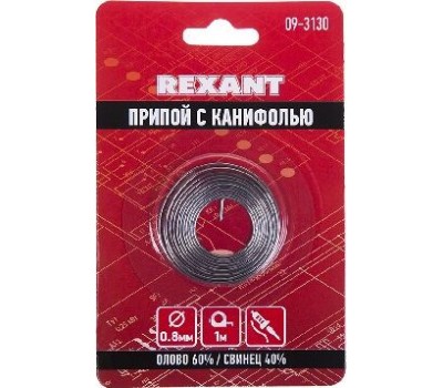 Припой REXANT (09-3130) ПРИПОЙ С КАНИФОЛЬЮ , 1 М, 0.8 ММ, (ОЛОВО 60%, СВИНЕЦ 40%), СПИРАЛЬ, БЛИСТЕР