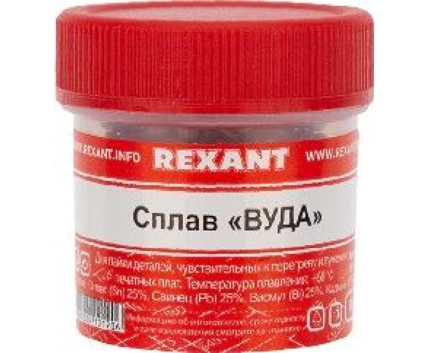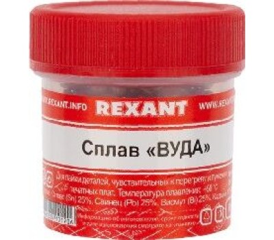 Припой REXANT (09-3493) ПРИПОЙ "СПЛАВ ВУДА" , 50 Г, (ОЛОВО 12.5%, СВИНЕЦ 25%, ВИСМУТ 50%, КАДМИЙ 12.5%), БАНОЧКА