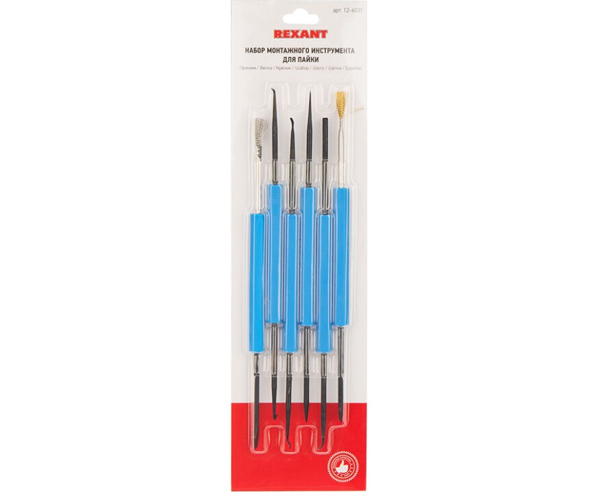Набор для пайки (6 предметов) предназначен для монтажных и ремонтных работ с радиоэлементами на платах, в корпусах аппаратуры, в часовых механизмах и т. п. В набор входит: Прижим — служит для удержания или прижимания различных элементов. Вилка, Крючок, Шабер, Шило, Кисточка.