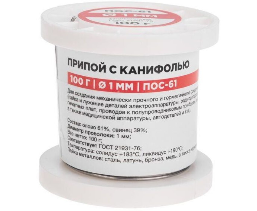 Припой с канифолью ПОС-61 используется для создания прочного и герметичного соединения деталей и их фиксации на плате. Предназначен для пайки и лужения деталей электроаппаратуры, радиоаппаратуры, точных приборов, печатных плат, медицинской аппаратуры. Наиболее эффективен в случаях, когда нельзя допустить перегрева места пайки. Нагреваясь до температуры +190°C припой расплавляется, смачивает спаиваемый металл и растекается, заполняя место между соединяемыми деталями. Представляет собой проволоку с каналом канифоли из сплава олова (61%) и свинца (39%). Изготовлен в соответствии с ГОСТ 21931-76. Отличается минимальным интервалом кристаллизации (7°C), устойчивостью к коррозии и удельной проводимостью (для токоведущих элементов). Фасовка – катушка с проволокой диаметром 1 мм. Температура плавления: солидус +183°C, ликвидус +190°C. Пайка металлов: сталь, латунь, бронза, медь, нержавейка.