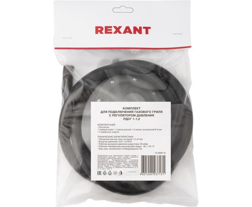 REXANT Комплект для подключения газового гриля с регулятором давления РДСГ 1-1,2 под шланг с внутренним диаметром 9 мм