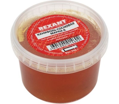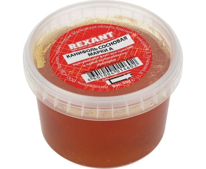 Канифоль сосновая марки А 500 г REXANT предназначена для удаления тонких и нестойких оксидов с поверхности под пайку, улучшения растекания жидкого припоя при пайке печатных плат и радиокомпонентов.