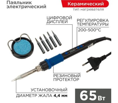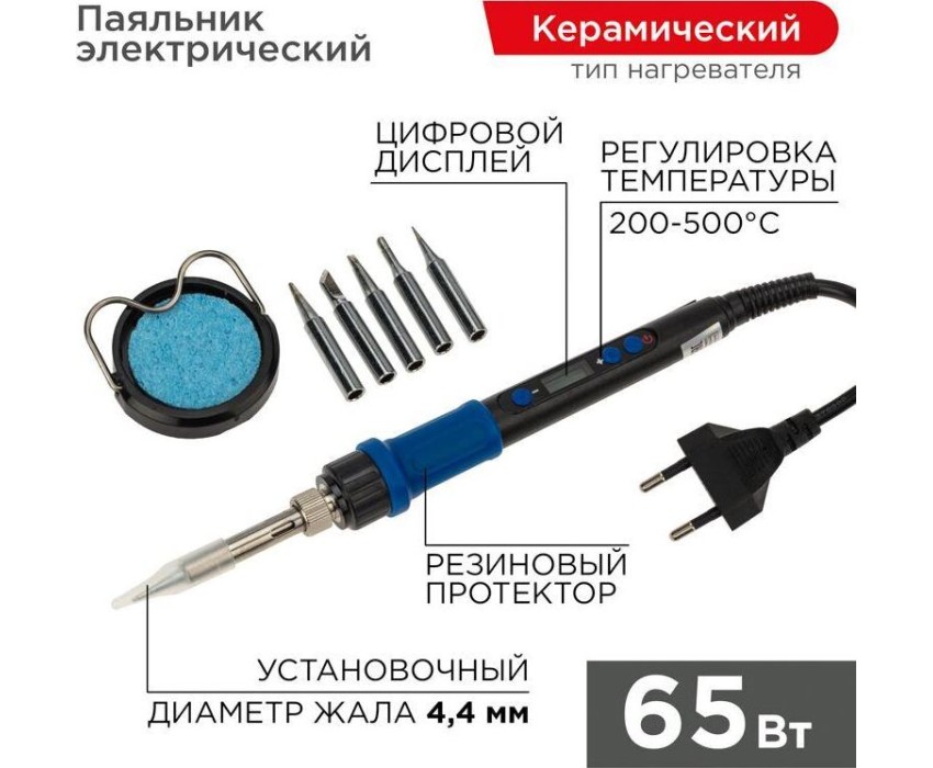 REXANT Набор для пайки (паяльник цифровой с керамическим нагревателем 65Вт, 200-500°C, подставка с губкой, набор из 5 жал)