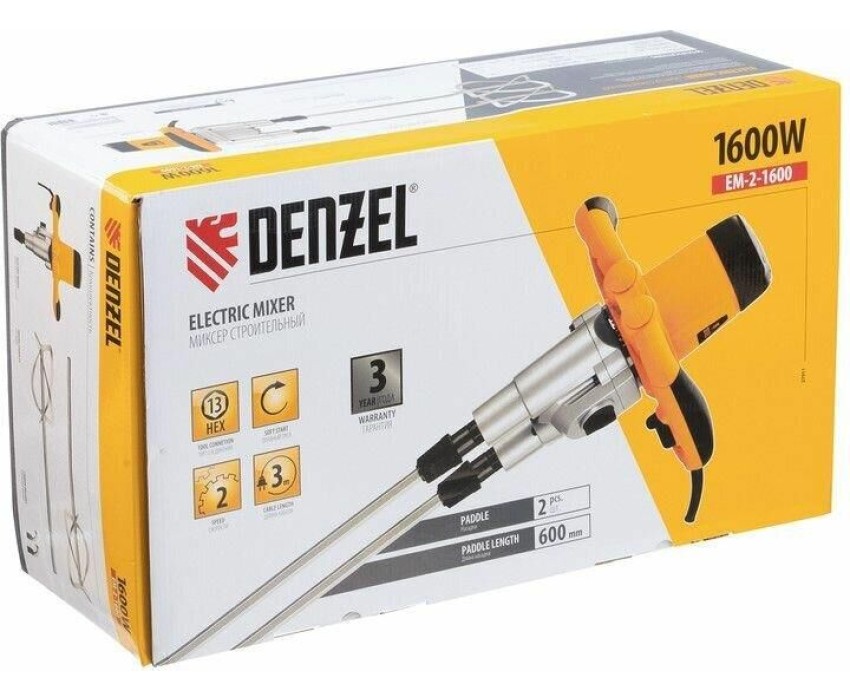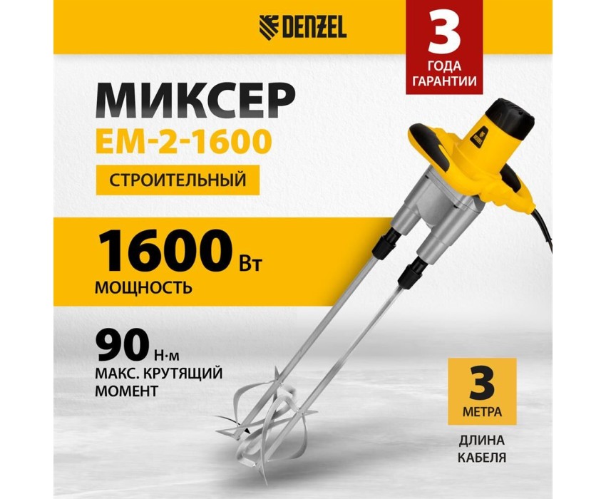 Миксеры DENZEL EM-2-1600, Миксер строительный 1600 Вт, 200-480/250-680 об/мин 27911
