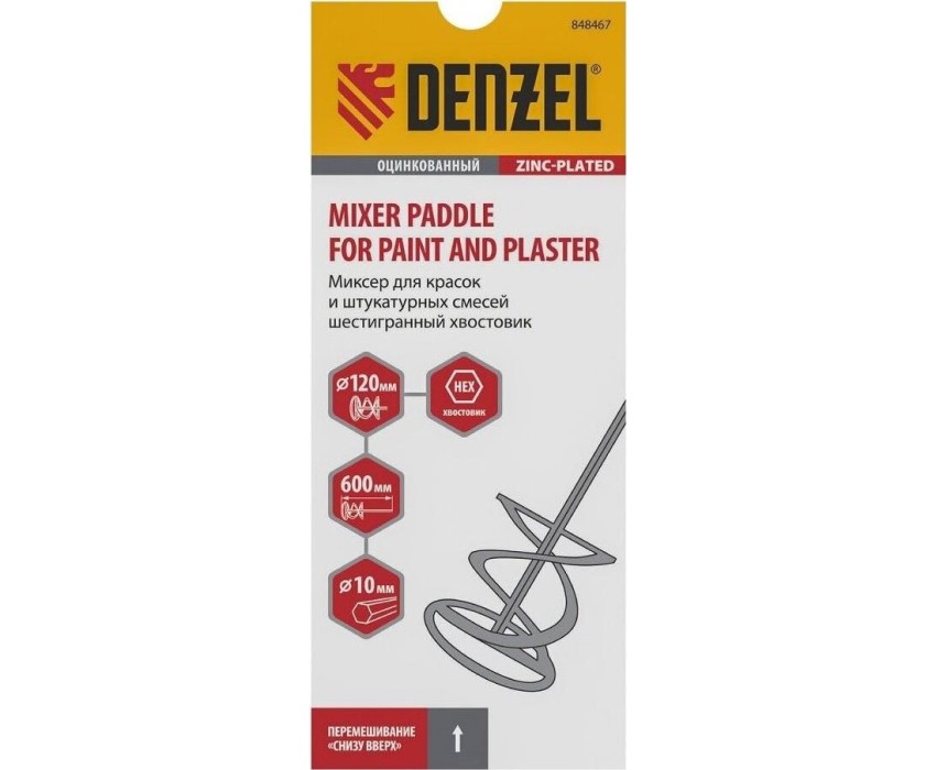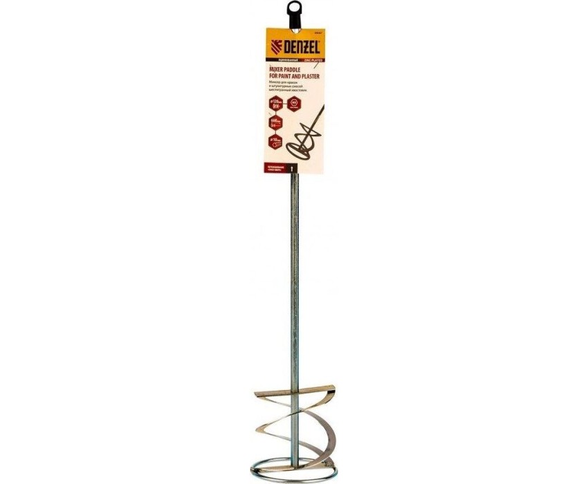 Миксер строительный DENZEL Миксер для красок и штукатурных смесей, 120 х 600 мм, оцинкованный, шестигранный хвостовик 10мм 848467