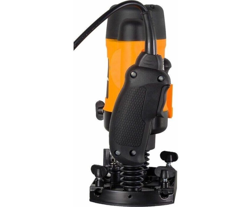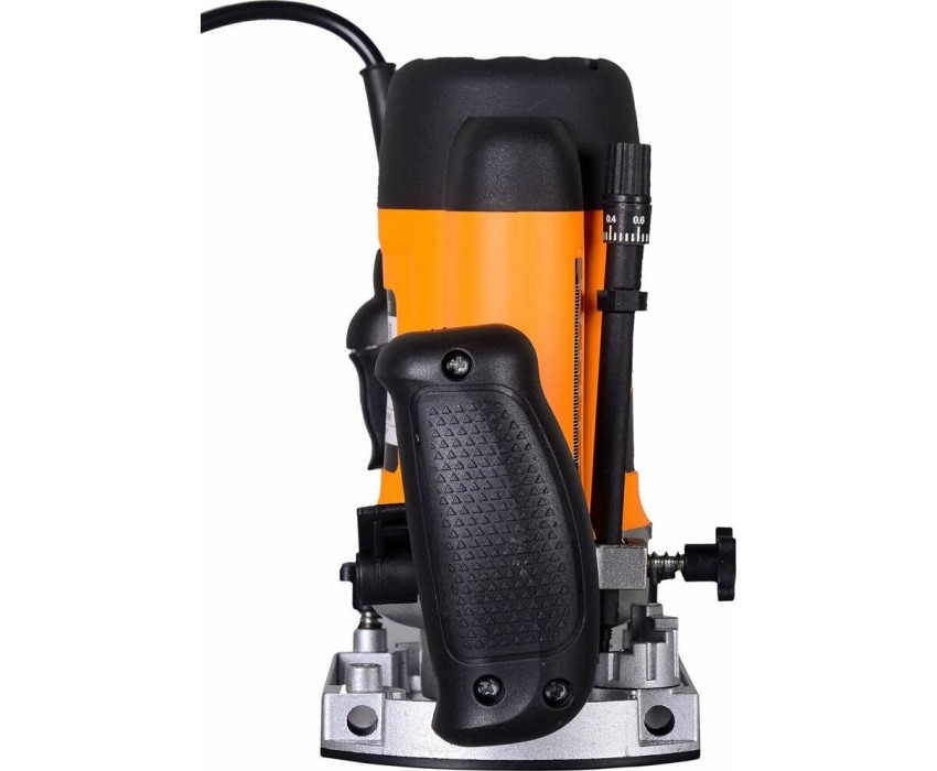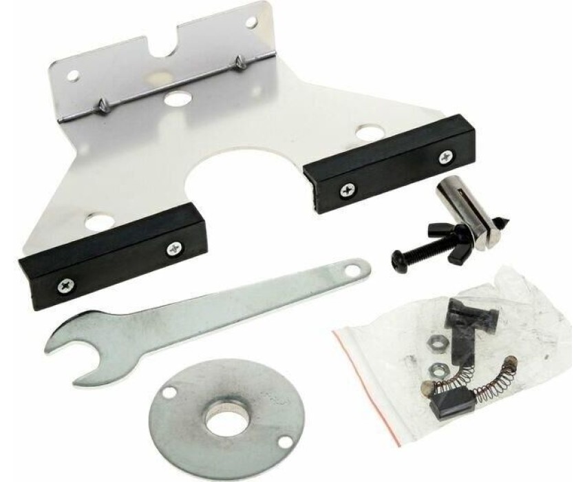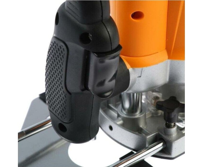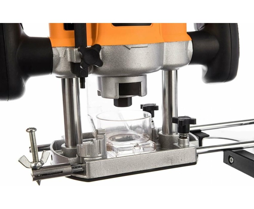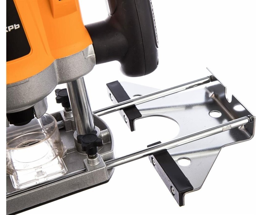 Фрезерная машина, боковой упор 1 шт., пылеотводный патрубок 1 шт., цанга 6 мм 1 шт., цанга 8 мм 1 шт., ключ рожковый 1 шт., стержень для крепления бокового упора 2 шт., центр 1 шт., переходная пластина 1 шт., паспорт