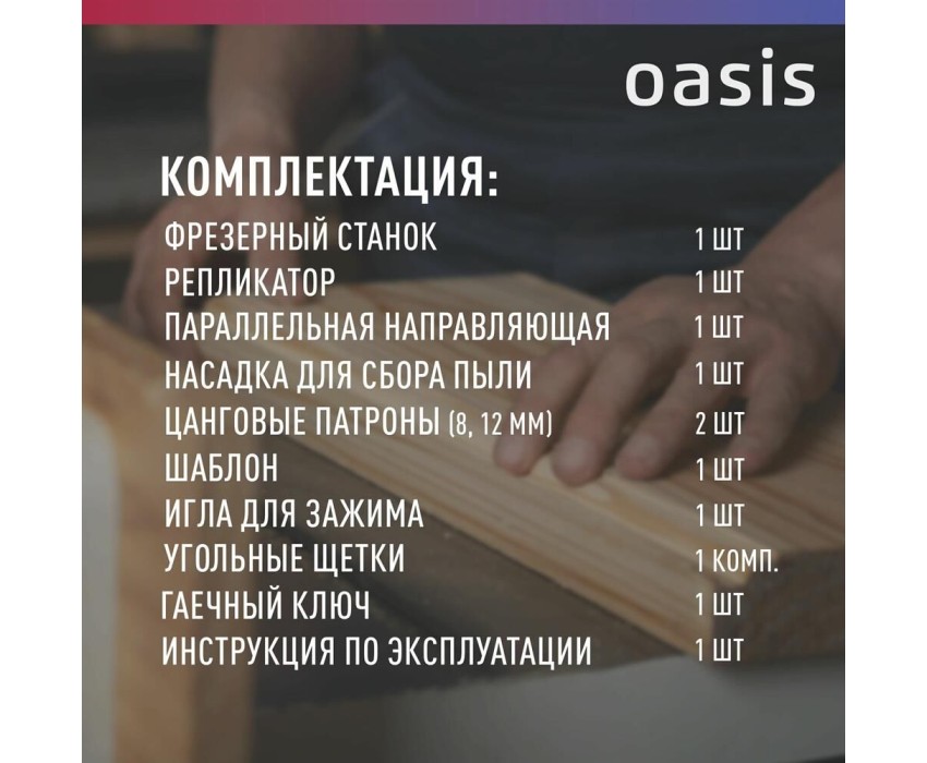 Фрезерный станок – 1 шт. Репликатор - 1 шт. Параллельная направляющая – 1 шт. Угольные щетки – 1 комп. Насадка для сбора пыли – 1 шт. Цанговые патроны – 2 шт. (8, 12 мм) Шаблон – 1 шт. Игла для зажима – 1 шт. Гаечный ключ – 1 шт. Инструкция по эксплуатации – 1 шт