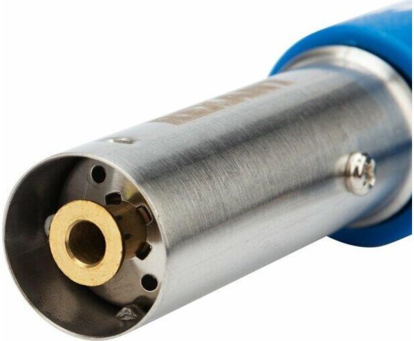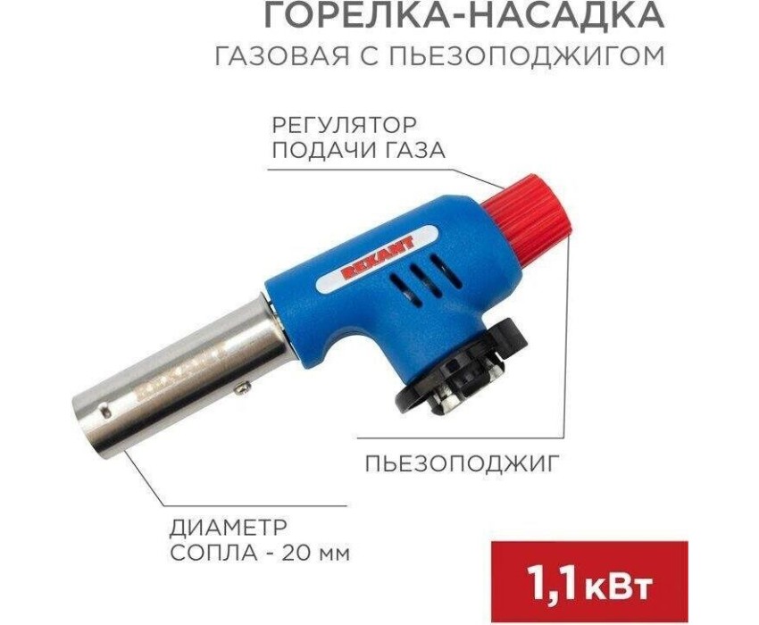 Газовая горелка-насадка, мощность: 1,1кВт 0,96 ккал , температура пламени: 1400 С (макс.), расход газа: 80 гр/ч, тип поджига: встроенный пьезо, материал: медь + нержавеющая сталь + алюминий + сплав цинка + пластик, сфера применения: от плавления и сварки до копчения продуктов, тип газового баллона: ТВ-220 (цанговый).