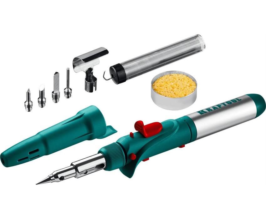 KRAFTOOL SolderGas, 120 K, 30 - 120 Вт, 1300°С, горелка, фен, пьезоподжиг, набор 10 в 1, газовый паяльник (55503-H10)