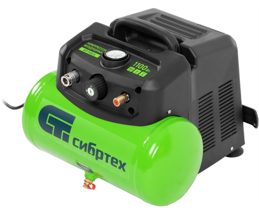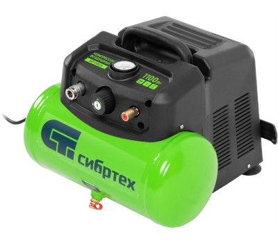 Воздушный безмасляный компрессор Сибртех BL 1100/6 58059 мощностью 1100 Вт, с ресивером емкостью 6 литров, служит для подачи сжатого воздуха под давлением до 8 бар со скоростью 180 л/мин. К нему можно подключить краскораспылитель, продувочный пистолет, заклепочник, пистолет для накачки шин и другой пневмоинструмент. Отсутствие масла делает компрессор оптимальным для выполнения покрасочных работ и продувки электронных компонентов. Устройство предназначено для бытового использования.,Одна из основных особенностей данной модели — компактность и удобство в перевозке. Компрессор отличается небольшим весом и дополнен эргономичной транспортировочной ручкой. Преимущества Автономность — прессостат обеспечивает автоматический запуск двигателя и его остановку в зависимости от уровня давления в ресивере. Простая подготовка к работе — быстроразъемный выходной коннектор «Рапид» (евро) позволяет легко подключить пневмоинструмент. Удобное управление — при помощи поворотного регулятора на передней панели можно установить нужное значение давления. Контроль давления в ресивере — в верхней части корпуса расположен манометр, для считывания показателей не нужно наклоняться. Предохранительный клапан — возможность сброса избыточного давления позволяет избежать аварийных ситуаций. Продуманная конструкция — виброгасящие опоры обеспечивают устойчивость компрессора во время работы.