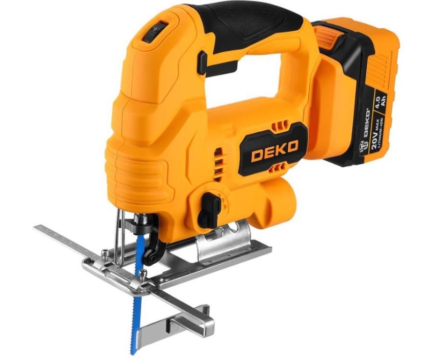 Лобзик аккумуляторный DEKO ; ;DKJS20E, 1x4.0Ah ;используется для распиливания дерева, металла, пластика, резины при отделочных или ремонтных работах. ;Наличие бесключевого патрона значительно облегчает замену полотна. ;Два режима маятникового хода позволяют ускорить работу. Подошва может наклоняться до 45 градусов в обе стороны. ; Характеристики:Напряжение: 20 ВЕмкость АКБ: 2000 мАчЧисло ходов: 800-2700 ход/минХод пилки: 19 ммМакс. глубина реза дерева: 65 ммМакс. глубина реза металла: 6 мм Комплектация:Лобзик – 1 штАКБ – 1 штЗарядное устройство – 1 шт ;Пильное полотно – 1 штПараллельный упор – 1 штШестигранный ключ – 1 штРуководство по эксплуатации – 1 шт