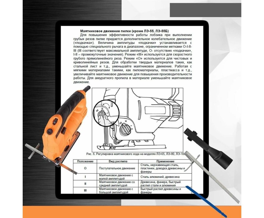 Мощность: 850. Глубина резания (дерево): 100. Глубина резания (сталь): 10. Маятниковое движение: есть. Тип маятникого движения: 3-х или 4-х ступенчатое. Регулировка хода колебаний: есть. Регулировка положения опорной плиты: есть. Тип регулировки положения опорной плиты: до 45 град.. Замена режущего полотна без инструмента: есть. Встроенная подсветка: нет. Встроенный лазерный маркер: есть. Встроенный пылесборник: нет. Возможность подключения пылесоса: есть. Функция сдува опилок: нет. Встроенный отсек для хранения полотен: нет. Противоударный корпус: нет. Жесткий кейс в комплекте: отсутствует. Длина сетевого кабеля: 1.5. Длина инструмента: 234. Высота инструмента: 260. Вес товара: 2.6. Комплект поставки: Лобзик, параллельный упор, паспорт, коробка.. Тип электропитания: от электросети. Габариты упаковки (ед) ДхШхВ: 0.26x0.09x0.24. Вес упаковки (ед): 3.6. Гарантия: 12 мес.. Число ходов: 800 - 3000 ход/мин. Тип электропитания: от электросети. Число ходов: 800 - 3000 ход/мин. Глубина пропила: дерево 100 мм, сталь 10 мм. Особенности: маятниковое движение, регулировка хода колебаний. Мощность: 850 Вт. Вес: 2.6 кг