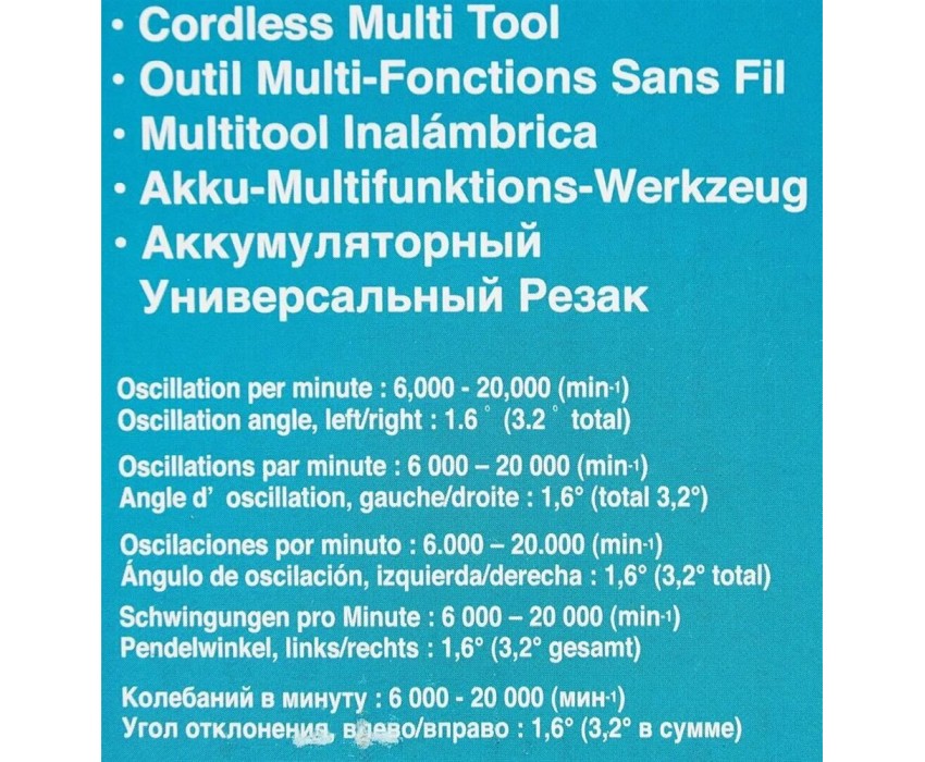 Мощность: 390. Регулировка частоты колебаний: есть. Угол колебания влево/вправо: 3.2. Сегментированный пильный диск в комплекте: нет. Пильное полотно в комплекте: нет. Дельташлифпластина в комплекте: нет. Рукоятка с мягкой накладкой: есть. Цвет: синий. Дополнительный цвет: черный. Тип электропитания: от аккумулятора. Количество аккумуляторов в комплекте: без аккумулятора. Зарядное устройство в комплекте: нет. Габариты упаковки (ед) ДхШхВ: 0.3x0.18x0.18. Вес упаковки (ед): 2. Вес товара: 2. Гарантия: 12 мес.. Число колебаний: 6000 - 20000ход/мин. Аккумулятор: Li-Ion, 18 В. Размеры товара (ДхШхВ): 340х80х. Функции: регулировка оборотов