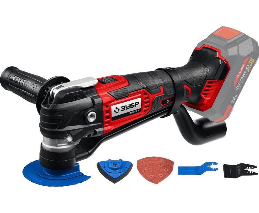 Реноватор аккумуляторный ЗУБР - универсальное устройство для разных строительных работ (резка, шлифование), особенно в труднодоступных местах и в отсутствие доступа к электричеству. Большой угол колебаний 3 градуса в сочетании с широким спектром регулировки частоты обеспечивают эффективную работу с любым материалом. Расширенная комплектация включает в себя базовый набор насадок для начала работы сразу после покупки Преимущества Экономия до 40% стоимости инструмента при наличии аккумуляторов системы Универсальный инструмент для пиления, шлифования, резки и зачистки Патрон универсальной системы Quick Unilock (OQIS) с бесключевой фиксацией Угол колебаний 3 градуса увеличивает производительность изделия Электронная регулировка частоты колебаний позволяет подобрать оптимальный режим для каждого вида работы и материалов Двойной светодиод подсветки для работы в условиях ограниченного освещения Адаптер подключения к пылесосу поддерживает чистоту рабочей области Комплект наиболее востребованных насадок для начала работы сразу после покупки Дополнительная рукоятка для надежного удержания инструмента Мягкие накладки на корпусе позволяют надежно удерживать изделие в работе при любом хвате Использование Для резки, пиления, шлифовки заготовок из дерева, металла, керамики, пластика и т.д.