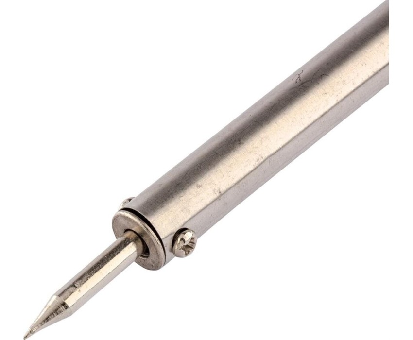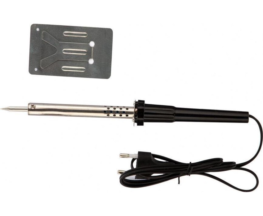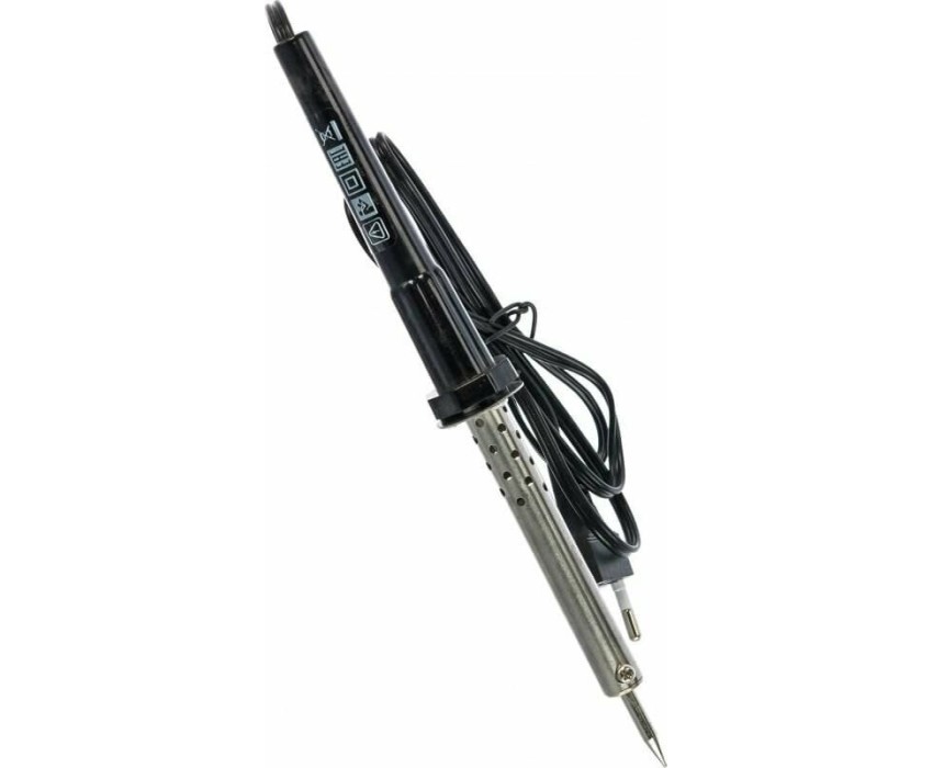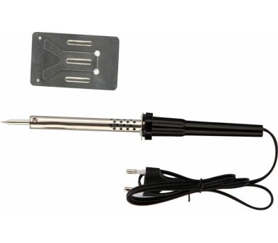Паяльник Sparta 913108 мощностью 60 Вт, с пластиковой ручкой, работает от сети 220 В, предназначен для пайки микросхем, транзисторов, проводов и используется для ремонта электроники и бытовой техники. Нагревательным элементом является нихромовая спираль, что повышает устойчивость прибора к повреждениям в результате удара или падения. Съемное жало при необходимости можно заменить.ПреимуществаЭкономия времени на подготовку к работе и обслуживание— медное жало быстро разогревается и легко чистится.Комфорт во время работы — пластиковая рукоятка удобно лежит в руке.Безопасность — прибор комплектуется металлической подставкой, которая позволяет избежать обугливания столешницы при соприкосновении с разогретым жалом.