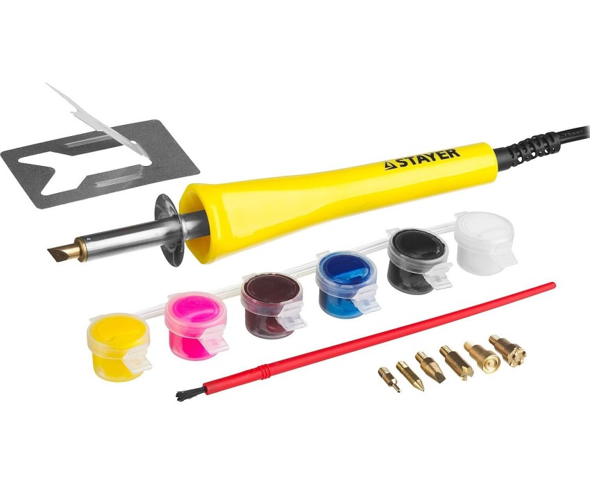 Оборудование STAYER создано на основе современных материалов и технологий. Благодаря соблюдению высоких стандартов качества, инструмент обеспечит надежную работу на протяжении всего срока службы. Является незаменимым помощником, обеспечивая удобство в работе и отличный результат. Преимущества 3 в 1: для выжигания по дереву, раскраски поверхности, и пайки Специальные насадки позволяют наносить узоры и орнаменты различной сложности, а также резать тонкий пластик Быстрый нагрев до максимальной температуры 520°С Эргономичная термозащищенная пластиковая рукоятка 6 красок и кисточка в комплекте 7 быстросъемных насадок Металлическая подставка для безопасной работы Использование Набор для выжигания по дереву, коже, и нанесения изображений на различные поверхности, а так же художественного оформления получившегося рисунка с помощью красок и кисти.