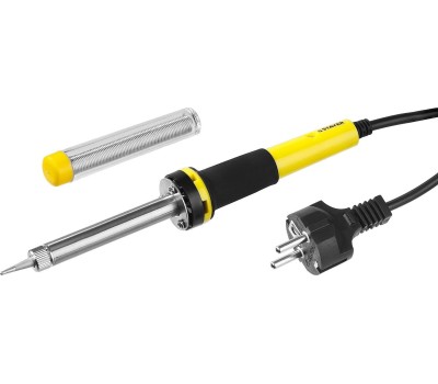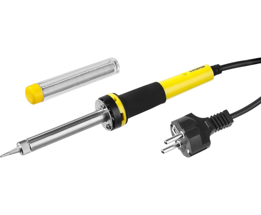 Паяльное оборудование STAYER изготовлено из высококачественных современных материалов. Профессиональный подход и учет всех тенденций развития рынка обеспечивают высокую надежность и длительный срок службы. оборудования. Преимущества Подставка и припой в комлекте Заземление Двухкомпонентная рукоятка Использование Электропаяльник непрерывного нагрева для монтажа электронных компонентов на печатную плату, пайки медных проводников сечением до 1 мм2