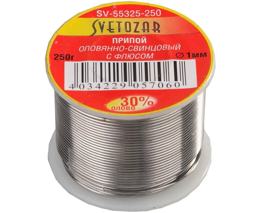 Припой оловянно-свинцовый СВЕТОЗАР – высококачественный сплав для пайки и лужения элементов электро- и радиоаппаратуры, печатных схем, точных приборов с высокогерметичными швами, медных проводов максимальная температура нагрева которых не должна превышать 200ºС. Оловянно-свинцовые припои торговой марки СВЕТОЗАР изготовлены из качественных компонентов и обеспечивают надежную пайку. Преимущества Состав: олово 30%/ свинец 70% Сердечник флюса находится внутри полой проволоки припоя Удобная катушка Температура пайки - 250°С Использование Предназначен для проведения паяльных работ.