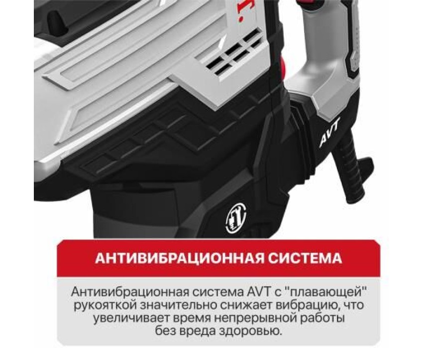 Тип патрона: SDS-MAX Мощность (Вт): 1700 Напряжение (В): 220 Частота ударов (уд/мин): 200 - 2100 Энергия удара (Дж): 45 Регулировка частоты и энергии удара: электронная Расположение двигателя: вертикальное Фиксация включённого состояния: да Регулировка положения зубила: да Количество положений зубила: 12 Антивибрационная система: AVT Регулировка доп. рукоятки: 360° Обрезиненный кабель питания: да