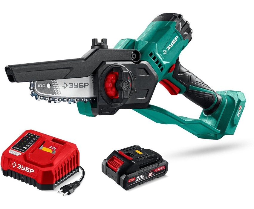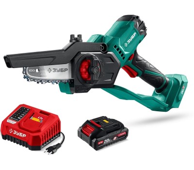 ЗУБР 20 В, 100 мм шина, 1 АКБ LMS (2 Ач), мини-пила цепная аккумуляторная (ПЦА-2010-21)