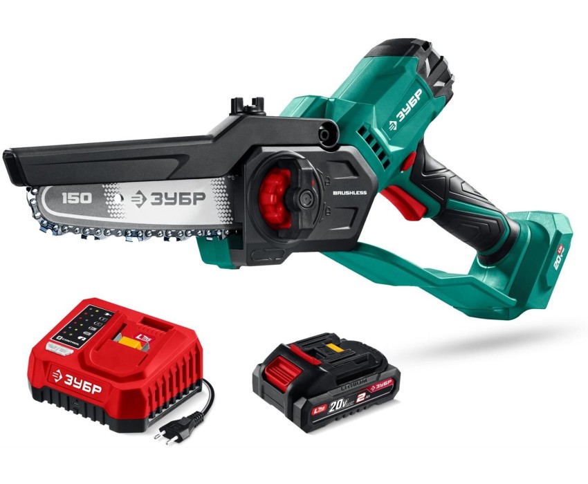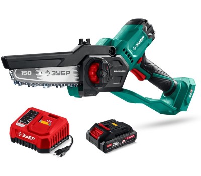 ЗУБР 20 В, 150 мм шина, 1 АКБ LMS (2 Ач), мини-пила цепная аккумуляторная (ПЦБ-2015-21)