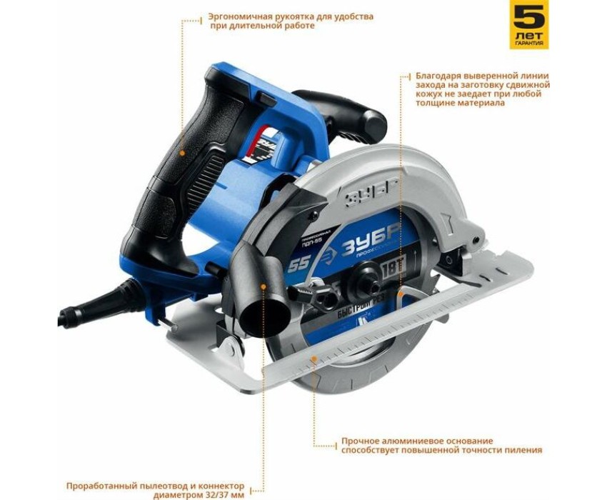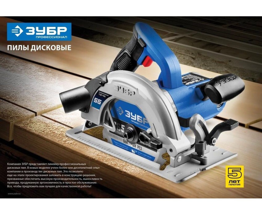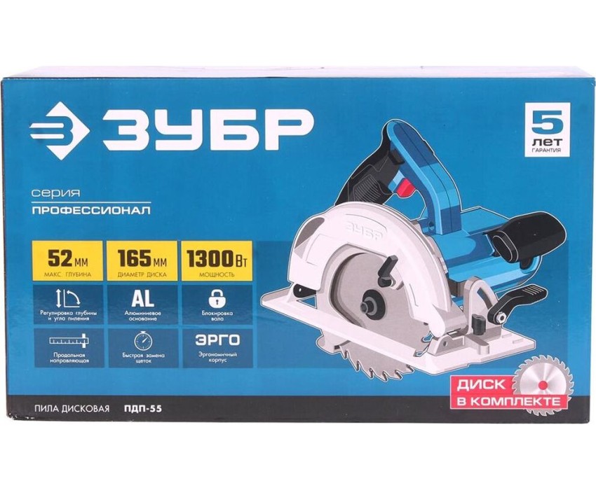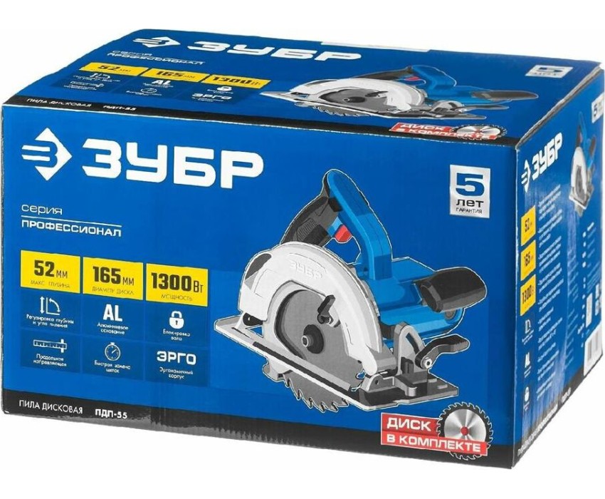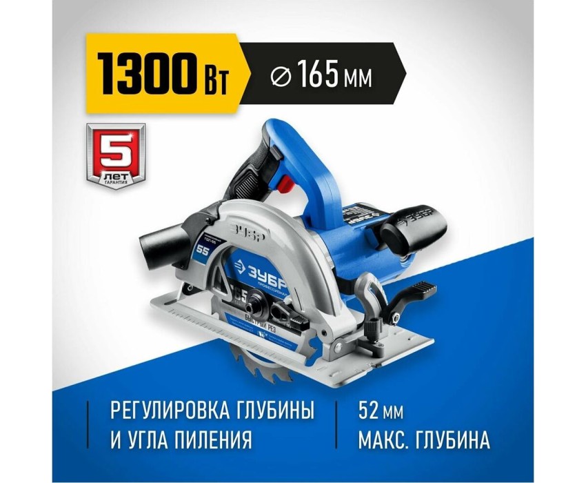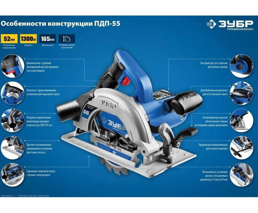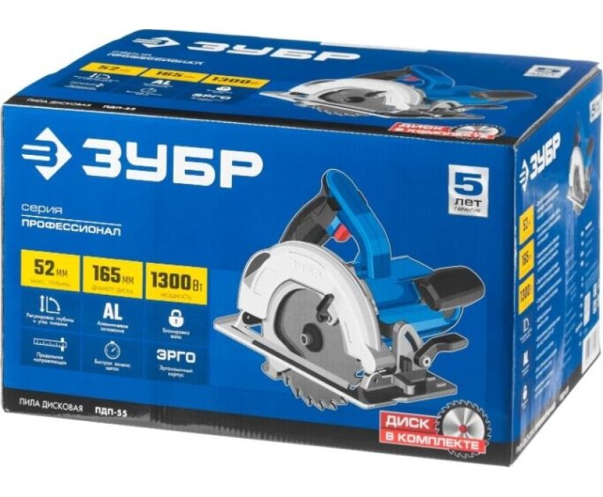 Пила дисковая ЗУБР ПДП-55 Пила дисковая, 90°-52 мм, диск 165 мм, 1300 Вт, Профессионал