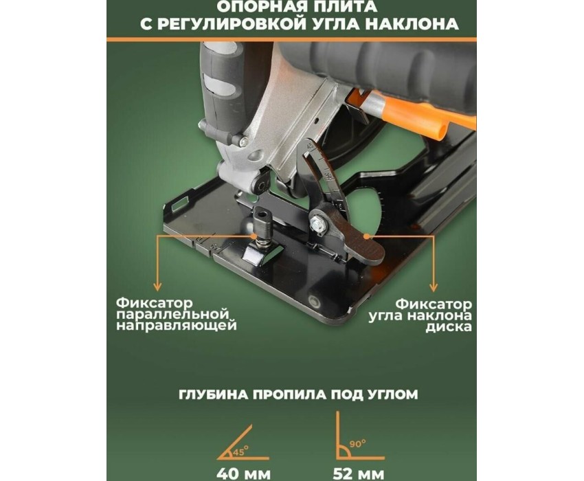 Класс товара Бытовой. Мощность, Вт 1200. Диаметр, мм 160. Посадочный диаметр диска, мм 20. Регулировка оборотов нет. Max глубина пропила под углом 90°, мм 52. Плавный пуск нет. Поддержание постоянных оборотов под нагрузкой нет. Длина кабеля, м 2. Мини-пила нет. Наличие патрубка для подключения пылесоса нет. Возможность работы с направляющей шиной есть. Вес нетто, кг 4,3. Габариты без упаковки, мм 502х315х510. Число оборотов, об/мин 5500. Max глубина пропила под углом 45°, мм 40.