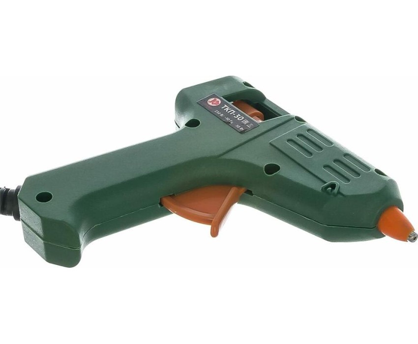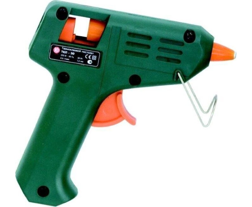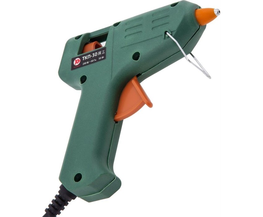 Термоклеевой пистолет электрический Калибр ТКП-30. Потребляемая мощность 30 Вт., Расход клея 4.5 гр/мин, Диаметр тубы 7.2 мм, Рабочая температура 150-190С.