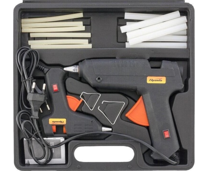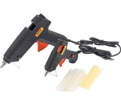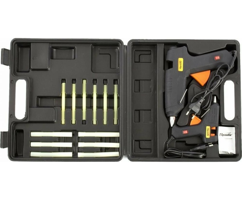 Набор Sparta 93038 в кейсе включает 2 клеевых пистолета с выключателями, мощностью 20/100 Вт, производительностью 3 и 8 г/мин, совместимых со стержнями диаметром 7 и 11 мм. Их используют для проведения несложных бытовых работ: склеивания бумаги, дерева, пластика и других материалов. Инструменты пригодятся частным мастерам при мелком ремонте, упаковке, сборке различных моделей и рукоделии.ПреимуществаНадежность — корпусы из ударопрочной пластмассы устойчивы к механическим повреждениям.Противокапельная система — клеевые стержни расходуются экономно, а рабочее место остается чистым.Быстрая подготовка к работе — время нагрева до максимальной температуры не превышает 5,5 минут.Контроль уровня расхода стержня — в пистолетах имеются смотровые окошки.Комфортная работа — конструкцией каждого инструмента предусмотрены металлическая скоба-подставка и выключатель.Удобное хранение и транспортировка — инструменты поставляются в пластиковом кейсе.