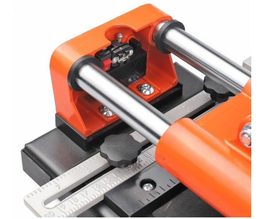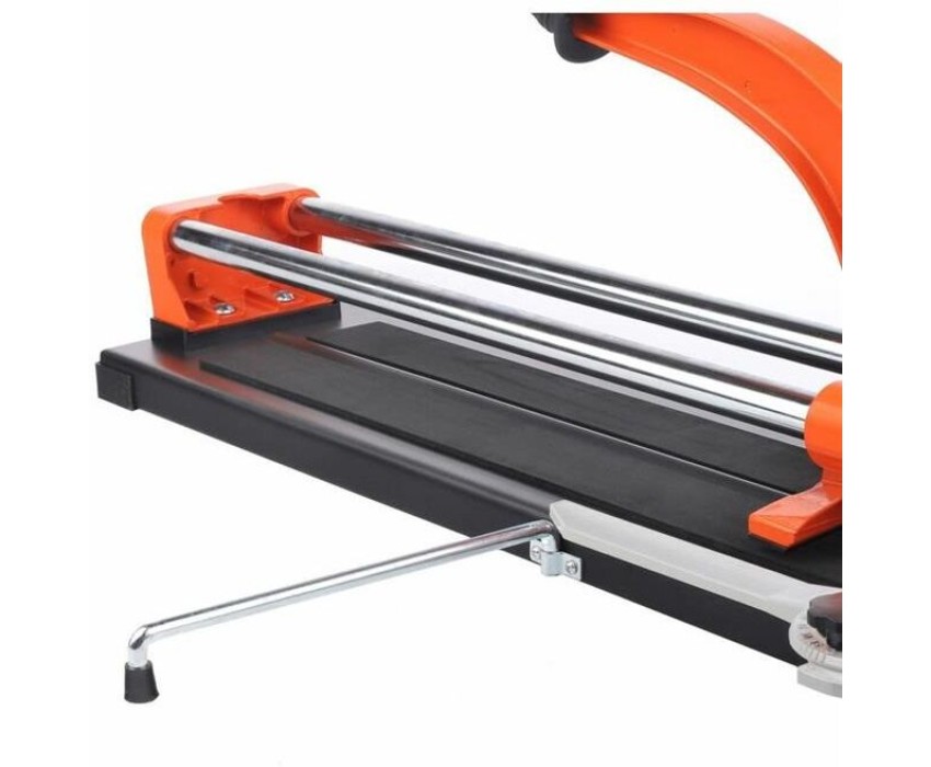 Модель имеет линейку-угольник для резки плитки под углом 30-45-60°, регулировки размера, дополнительной фиксации отрезаемой заготовки и точного положения плитки.