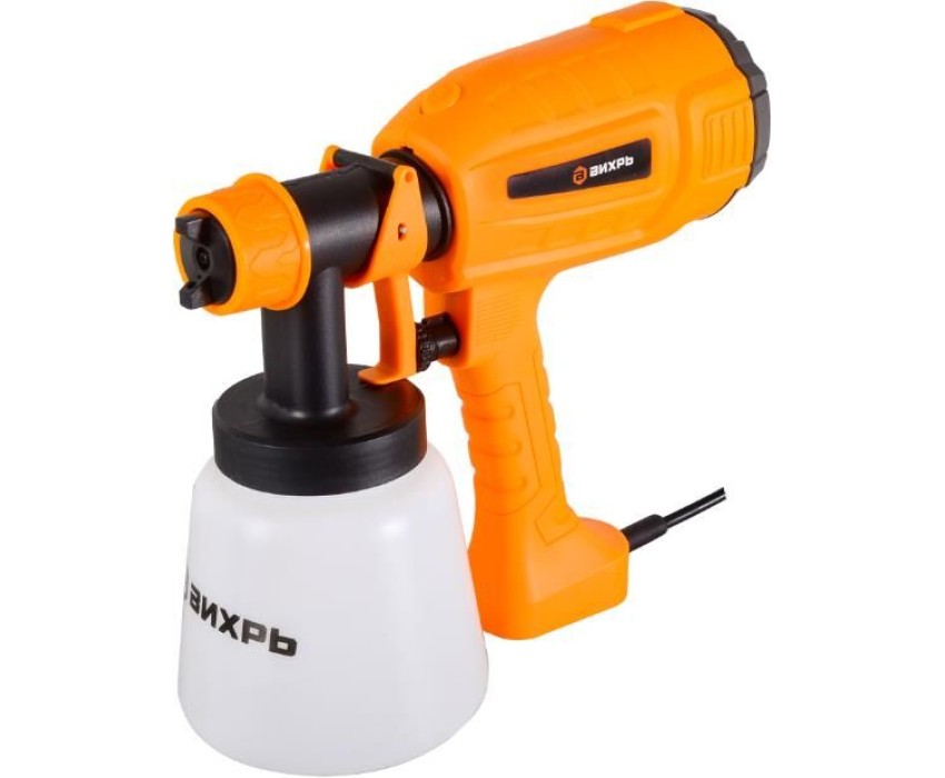 Электрический краскопульт Вихрь ЭКП-400 обеспечивает ровное покрытие малых поверхностей любой конфигурации краской, лаком и другими ЛКМ с вязкостью не более 80 DIN/ceк. Подходит для бытового использования в помещениях и на открытом воздухе при плюсовых температурах и влажности не выше 80%. Конструктивно Вихрь ЭКП-400 состоит из горизонтально расположенного двигателя, встроенной системы распыления HVLP, бака для ЛКМ с нижним расположением и рукояти с противоскользящим покрытием.
