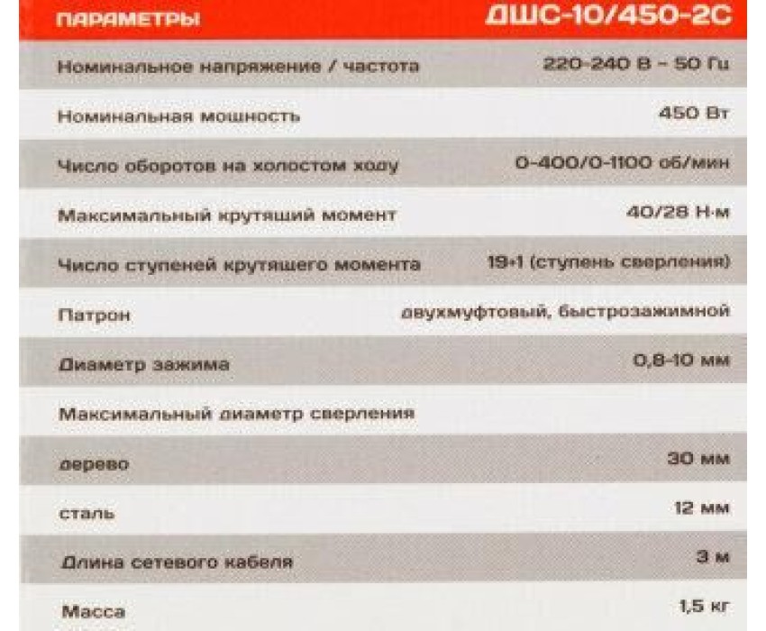 Потребляемая мощность, Вт 450. Напряжение сети / Частота, В/Гц 220±10%/50. Число оборотов на холостом ходу, об/мин 0-400/0-1100. Максимальный крутящий момент, Нм 40/28. Число ступеней крутящего момента 19+1 (ступень сверления). Патрон быстрозажимной, двухмуфтовый. Диаметр зажима, мм 0.8-10. Максимальный диаметр сверления дерева, мм 30. Максимальный диаметр сверления стали, мм 12. Габаритные размеры упаковки, см 23,5х7,5х23,5. Комплект поставки угольные щетки (запасной комплект) Гарантийный срок 3 года. Длина сетевого кабеля, м 3. Масса, кг 1,5. Масса с упаковкой, кг 1,8.
