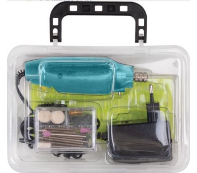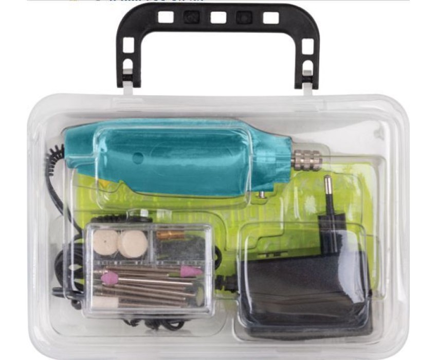 220 В / 12 В; 12000 об/мин; 3,2 мм; 0,4 А; 0,12 кг. Cерия мини, компактный размер. В наборе: адаптер 12 В, набор насадок, прозрачный пластиковый кейс. Цанговый патрон.