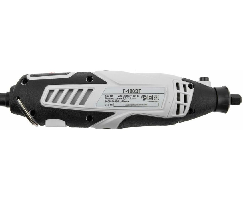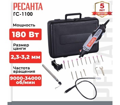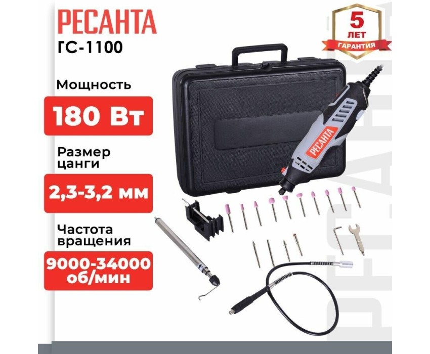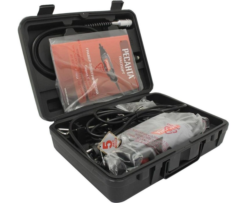 Тип: Гравер. Номинальная потребляемая мощность: 180. Плавная регулировка скорости вращения: есть. Электропитание: от сети. Жесткий кейс в комплекте: есть. Рукоятка с мягкой накладкой: есть. Вес товара: 700. Особенности: Гарантийный срок составляет 24 мес. со дня продажи. Расширенная гарантия 60 мес. предоставляется только при условии, если владелец зарегистрирует инструмент в течении 1 мес. с момента покупки на сайте компании Ресанта www.resanta.ru. Насадки: Набор насадок. Габариты упаковки (ед) ДхШхВ: 0.3x0.1x0.23. Вес упаковки (ед): 1.2. Гарантия: 24 мес.. Частота вращения на холостом ходу: 9000 - 34000 об/мин. Питание: от сети. Мощность: 180 Вт. Частота вращения: 9000 - 34000 об/мин. Вес: 700 грамм