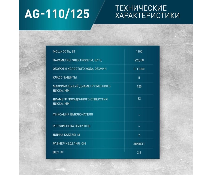 Мощность 1100 Вт; 220/50 В/Гц; диаметр диска 125 мм; Диаметр посадочного отверстия шлифкруга 22 мм; 3000-11000 об/мин;