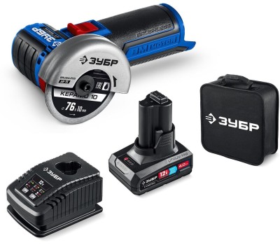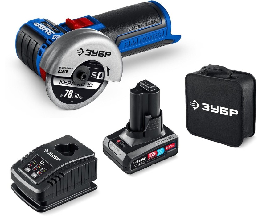 ЗУБР 12 В, D76 мм, 1 АКБ тип Т7 (4 А·ч), бесщеточная УШМ, сумка, Профессионал (AB-76-41)