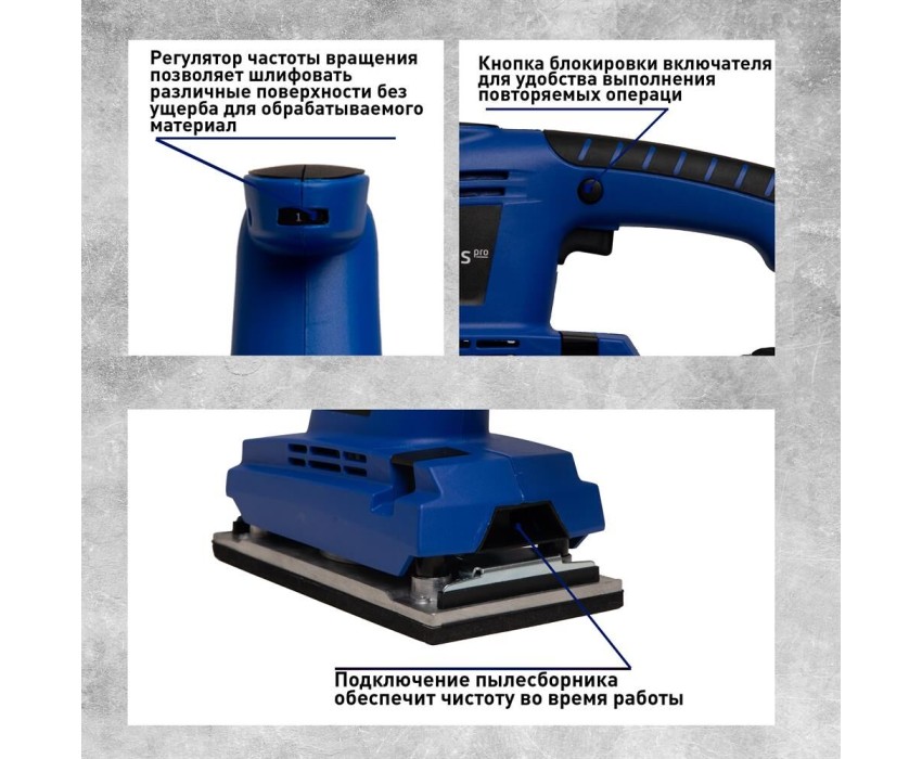 Мощность, Вт 400. Параметры электропитания, В/Гц 220/50. Число колебаний платформы на холостом ходу, кол/мин 6000-12000. Размер платформы, ШхД мм 113х225. Размер шлифовального листа, мм 115х280. Размеры изделия, см 30х11,3х18. Вес нетто, кг 2,6.