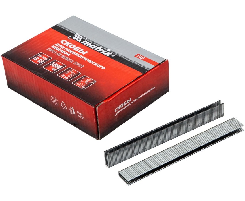 Скобы Matrix 57653 типа 18GA, 5000 шт. в упаковке, подходят к пневматическим степлерам, совместимым с крепежами сечением 1,25 х 1,0 мм, длиной 16 и шириной 5,7 мм. Их используют для фиксации ткани, бумаги, пластиковых и деревянных деталей на деревянных поверхностях. Скобы пригодятся для ремонтных и отделочных работ. Преимущества Прочность и коррозионная стойкость — скобы изготовлены из стали твердостью 310 HV и имеют предел прочности при растяжении 1100 Н/мм², а цинковое покрытие защищает их от воздействия влаги. Эффективная работа — скобы с заостренными концами легко пробивают даже твердые материалы. Продуманная комплектация — крепежи, склеенные в блоки, не рассыпаются, а упаковки из 5000 шт. хватит надолго.
