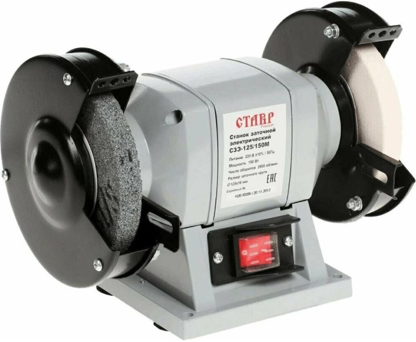 Потребляемая мощность, Вт 250. Напряжение сети / Частота, В/Гц 220±10%/50. Число оборотов на холостом ходу, об/мин 2950. Габаритные размеры упаковки, см 30х20х22,5. Размер заточного круга, мм O150x20. Посадочный диаметр круга, мм 12,7/32. Комплект поставки точильный круг 2 шт., защитный экран с креплением 2 шт., рабочая площадка с креплением 2 шт., адаптер 32 мм 2 шт. Гарантийный срок 3 года. Длина сетевого кабеля, м 2. Масса, кг 6,4