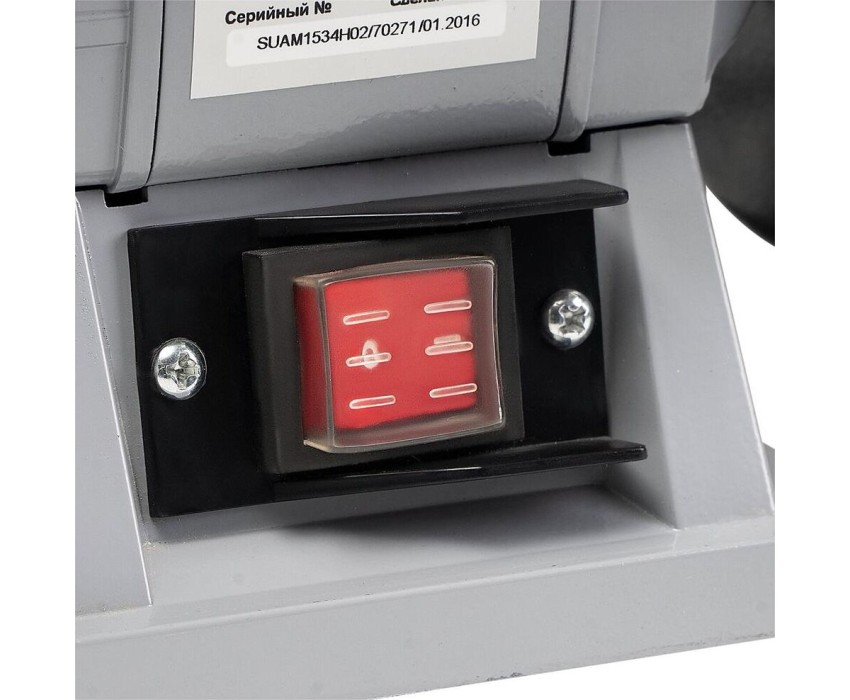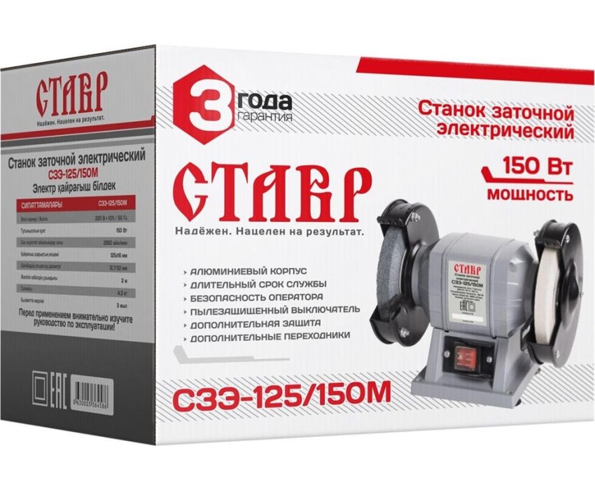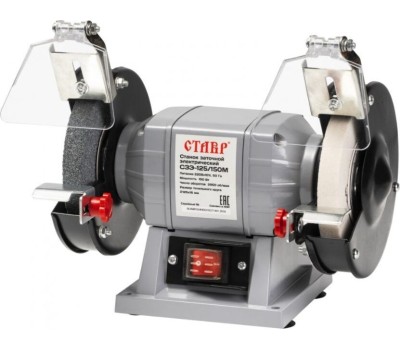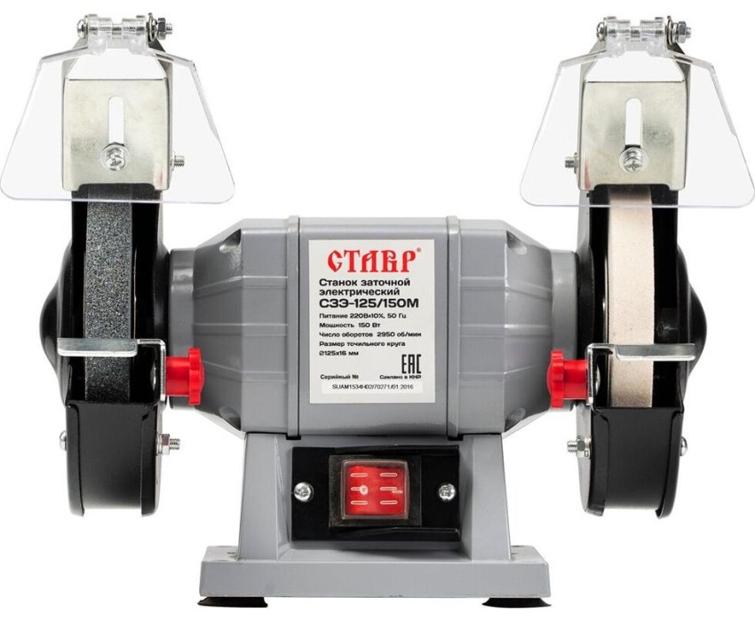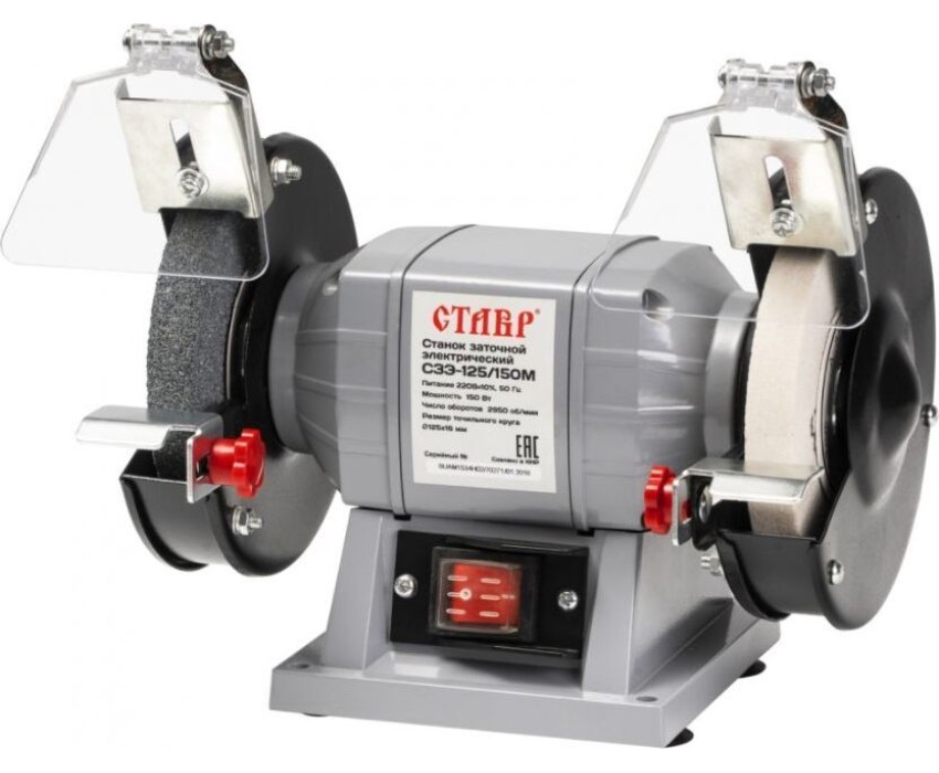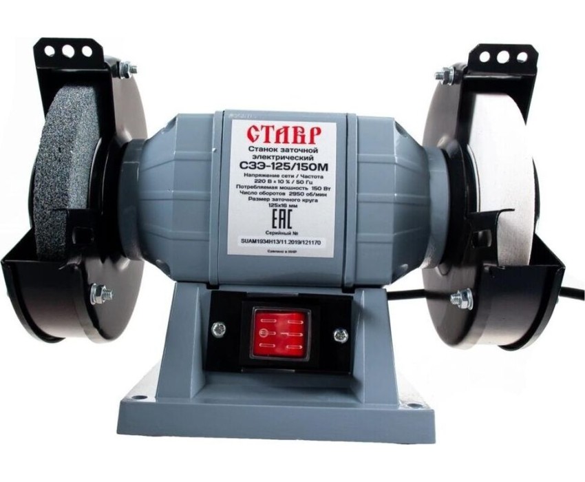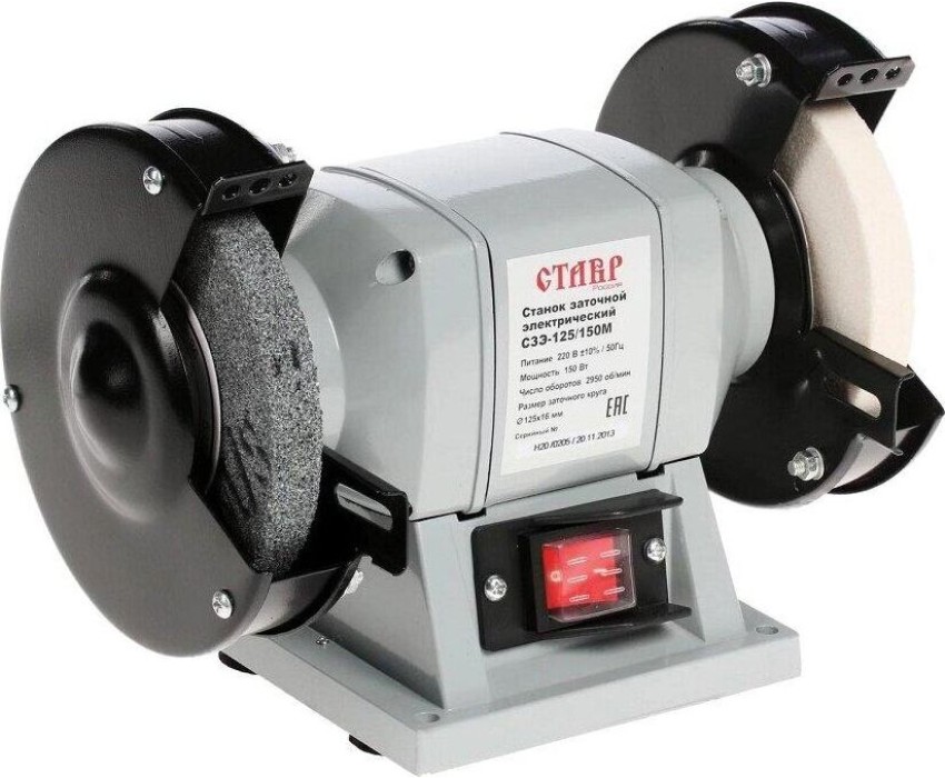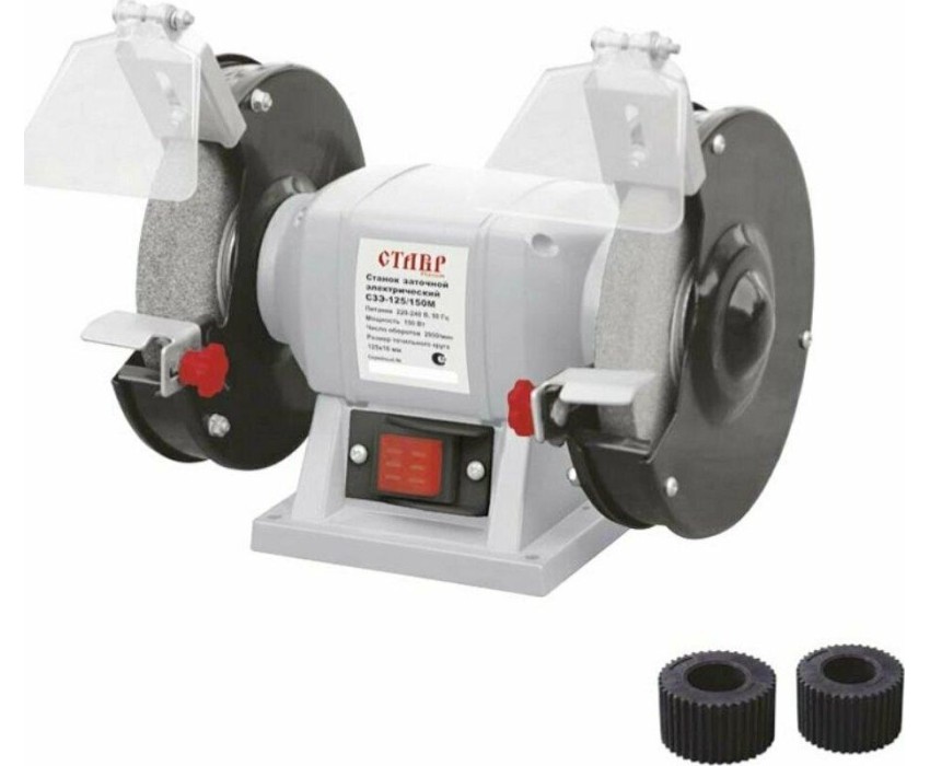 Потребляемая мощность, Вт 150. Напряжение сети / Частота, В/Гц 220±10%/50. Число оборотов на холостом ходу, об/мин 2950. Габаритные размеры упаковки, см 28,5х18х20,5. Размер заточного круга, мм O125x16. Посадочный диаметр круга, мм 12,7/32. Комплект поставки точильный круг 2 шт., защитный экран с креплением 2 шт., рабочая площадка с креплением 2 шт., адаптер 32 мм 2 шт. Длина сетевого кабеля, м 2. Масса, кг 4,3.