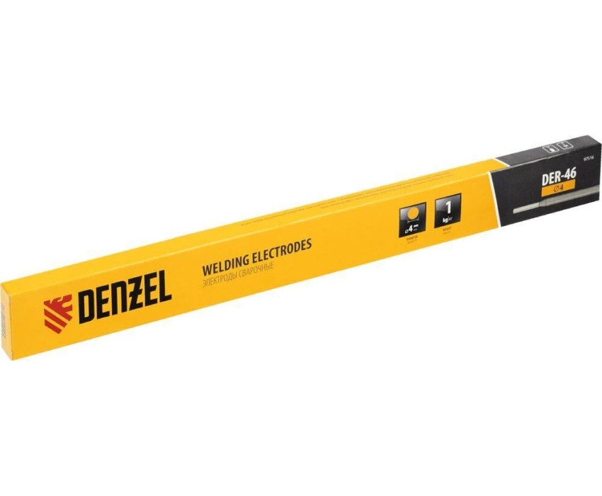 Электроды Denzel DER-46 97516 диаметром 4 мм, с рутиловым покрытием, 1 кг в упаковке, предназначены для ручной дуговой сварки деталей из углеродистых сталей при максимальном токе 200 А. Подходят для заготовок толщиной 3-5 мм. Электроды пригодятся для сварочных работ в гараже, мастерской или на даче.ПреимуществаРешение широкого спектра задач — электроды подходят для сварки в любом пространственном положении как при постоянном, так и переменном токе.Высокое качество сварки — разбрызгивание металла сведено к минимуму, шов получается ровный и прочный.Удобная эксплуатация — электроды обеспечивают быстрый поджиг и устойчивое горение дуги с легким отделением шлака.Гарантированное качество — характеристики электродов соответствуют ГОСТ.Большой запас — одной коробки хватит на длительный срок.