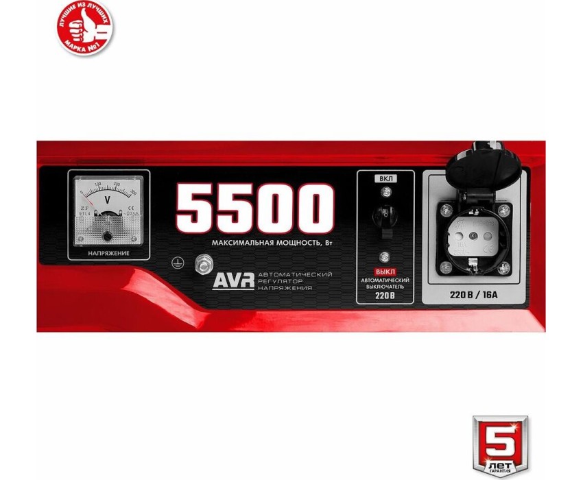 Вид топлива: бензин Аи92. Выход 12V: нет. Датчик масла: есть. Евро разъём Schuko 230V/16А: нет. Индикатор уровня топлива: есть. Колеса и ручки: нет. Контейнерный: нет. Контроль напряжения: AVR. Счетчик моточасов: нет. Тип двигателя: 4-х тактный. Тип электростанции: мобильные. Уровень шума, дБ: 73. Эл. выходы 380/220/12, шт: -/2/-. Минимальный заказ: 1. Max мощность, кВт: 5.5. Мощность номинальная при 220 В, кВт: 5. Напряжение, В: 220. Стартер: ручной. Альтернатор: синхронный. Автозапуск (АВР): нет. Емкость топливного бака, л: 25. Вес, кг: 72.