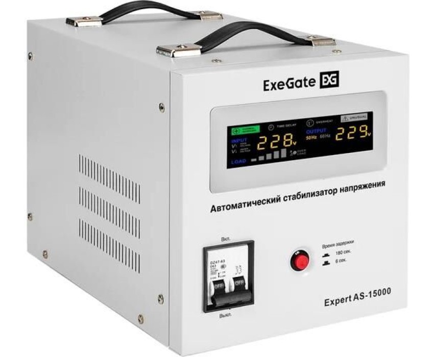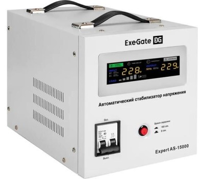 Стабилизатор напряжения ExeGate Expert AS-15000 (15000ВА, вход 140-260В, цветной дисплей, выход 220В±8%, КПД 98%, 5 уровней защиты, задержка, усиленный метал. корпус, клем.колодка, RTL)